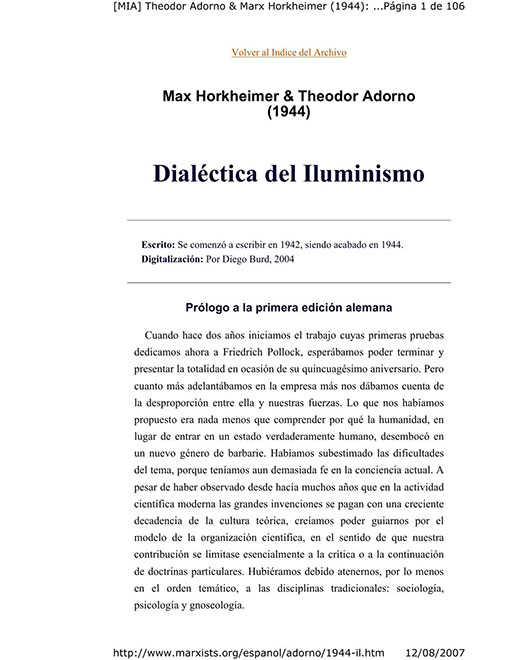 Dialéctica de la Ilustración (en alemán, Dialektik der Aufklärung) es una obra de filosofía y crítica social escrita por los filósofos de la Escuela de Frankfurt Theodor Adorno y Max Horkheimer, y publicada por vez primera en 1944. Una versión revisada apareció en 1947.